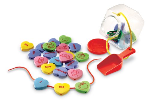 String together a little sweet talk These adorable lacing hearts feature a word or picture on each side so children can create colorful candy designs and cute messages while improving fine motor skills Hearts are color-coded to help children make sentences pSet includes 28 plastic hearts that Read More..